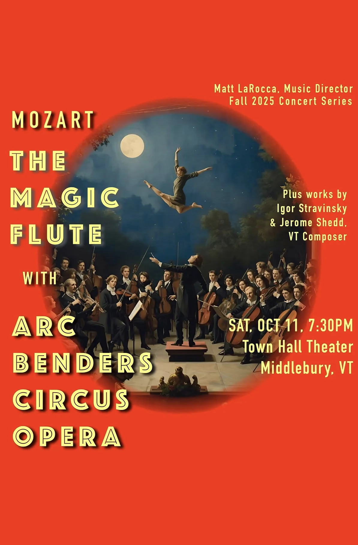 Saturday, October 11 at 7:30pmChamplain Philharmonic Orchestra presents Mozart’s The Magic Flute with Arc Bender Circus Opera from Brattleboro, VT helmed by Elizabeth Wohl, a trained soprano and circus performer, and lawyer by day. The opera will feature an aerialist (Elizabeth) who will sing while suspended in air, an acrobat, and a tenor.