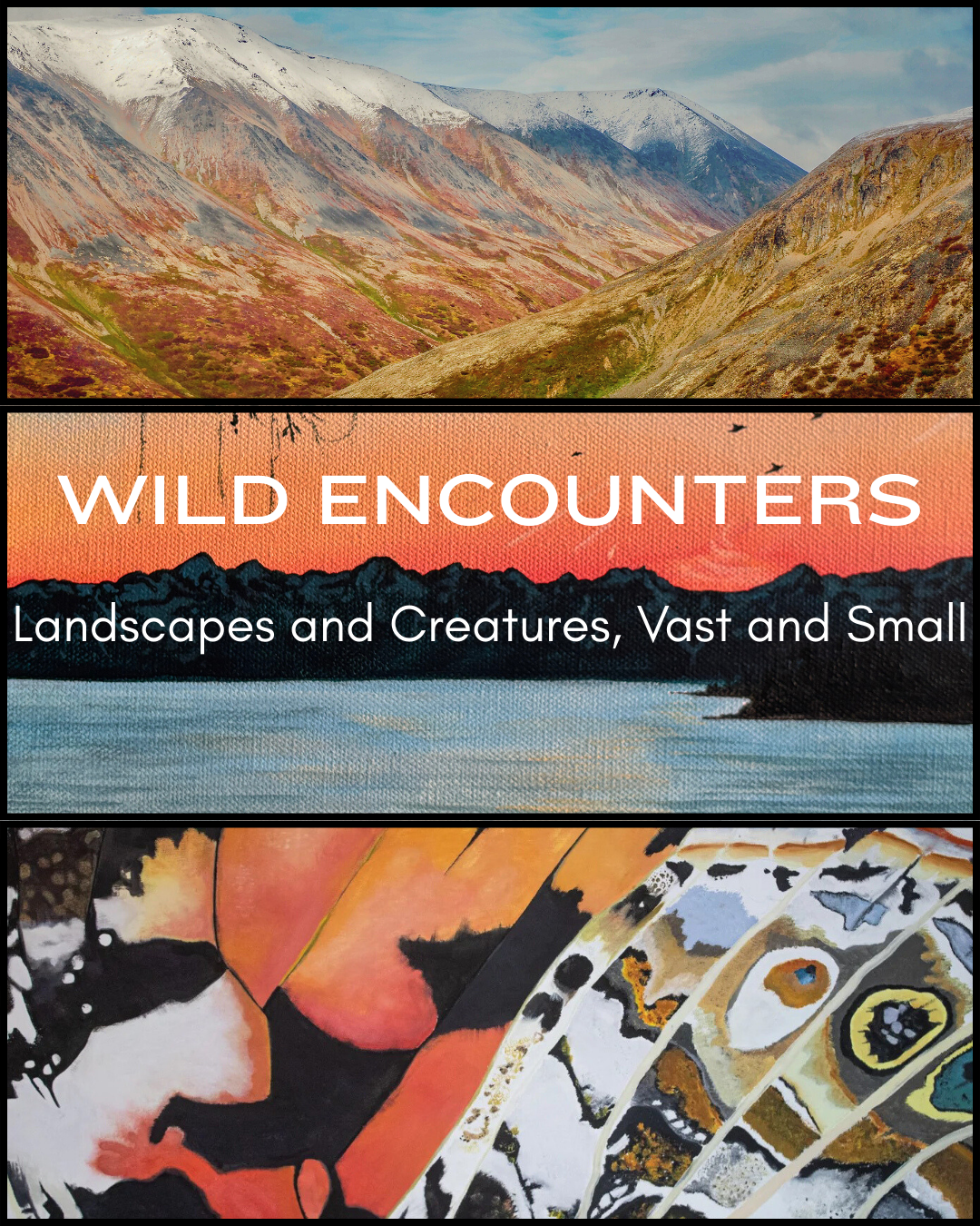 Through painting and photography, local artists McKenna Dickerson and Matthew Dickerson (daughter-in-law and father-in-law) share images of encounters with the natural world, especially in the wilder places of our public lands: national parks, national forests, and state parks. Matthew’s striking photographs capture animals in action in vivid detail and breathtaking wilderness landscapes. McKenna’s paintings often look abstract until close observation reveals that the images are zoomed-in views of textures, forms, and patterns in nature that often go unnoticed. Examples are the richly colored wings of a butterfly and, in contrast, the black and white feathers of a loon.