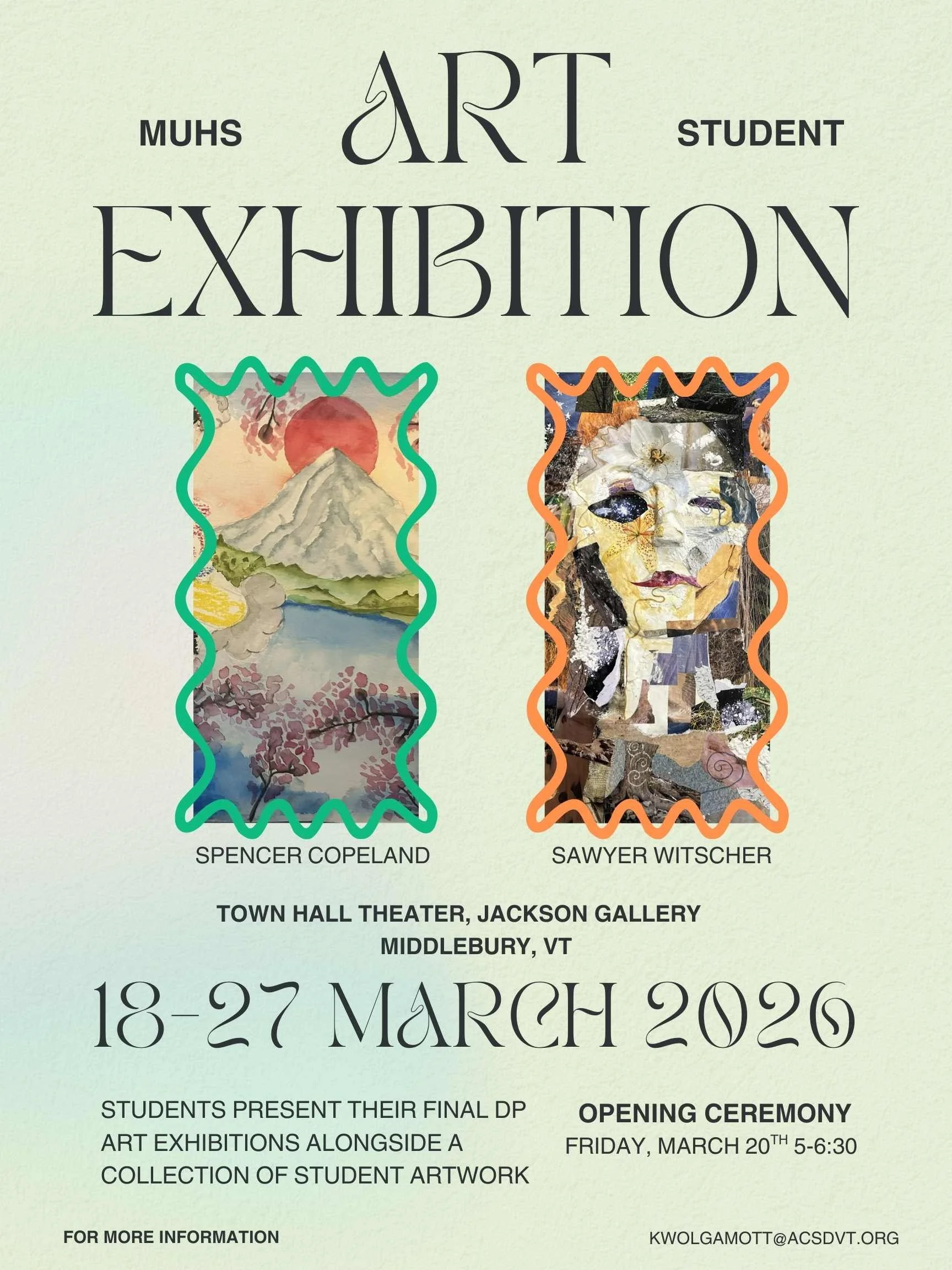 Students from Middlebury Union High School proudly present their final DP Art Exhibitions, alongside a diverse collection of student artwork.